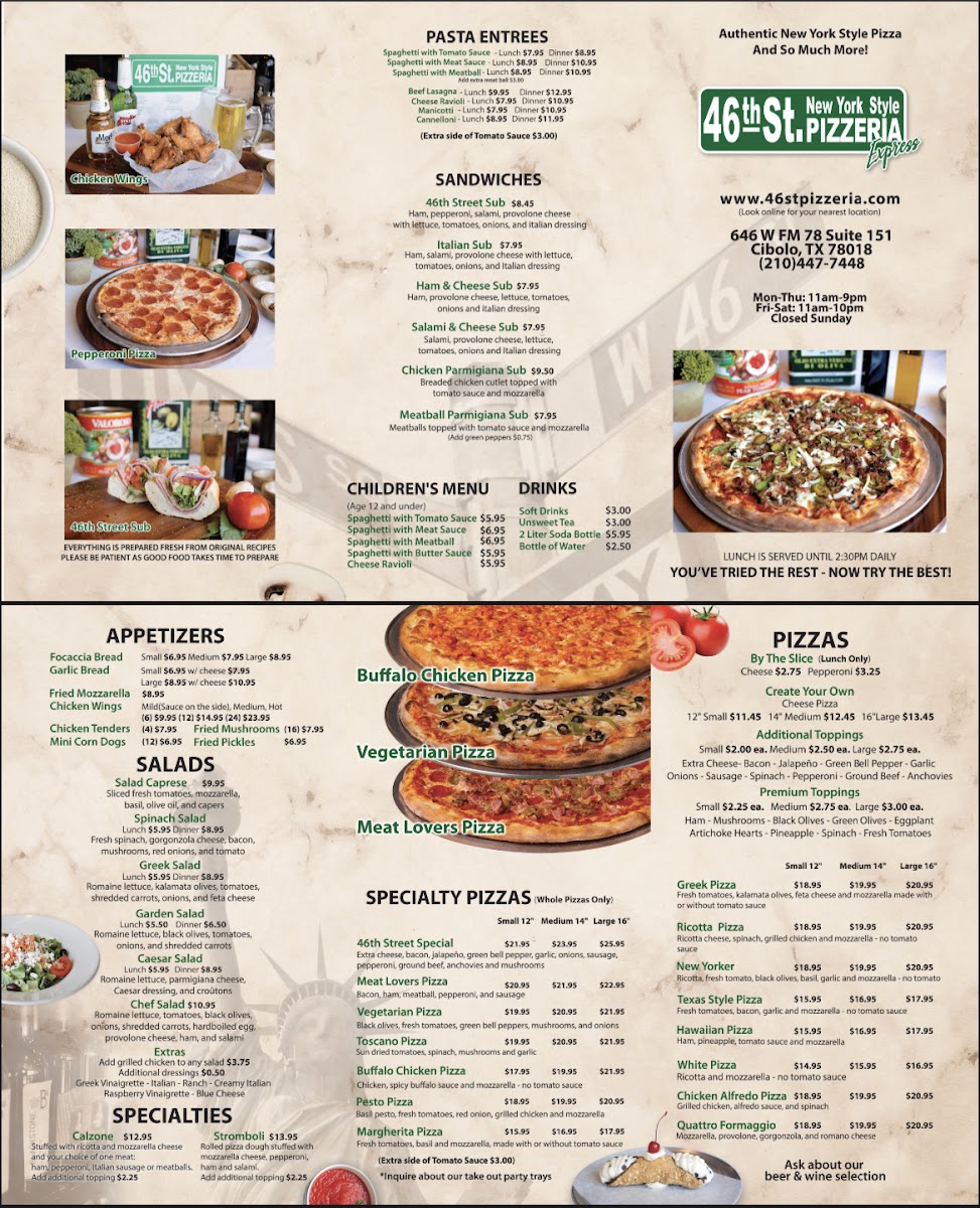 Welcome to 46th St. New York Style Pizzeria, your go-to spot in Cibolo for authentic NYC-style pizza. Located at 646 Farm-To-Market Rd 78, this pizzeria offers a delightful menu that caters to all pizza enthusiasts.